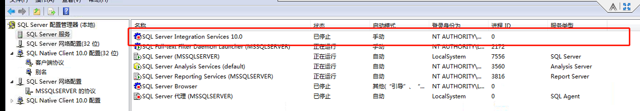 點(diǎn)擊:程序 -- Microsoft SQL Server -- 配置管理器,將SQL server integration services 10.0 ,狀態(tài)修改成停止,啟動(dòng)模式選擇成手動(dòng)