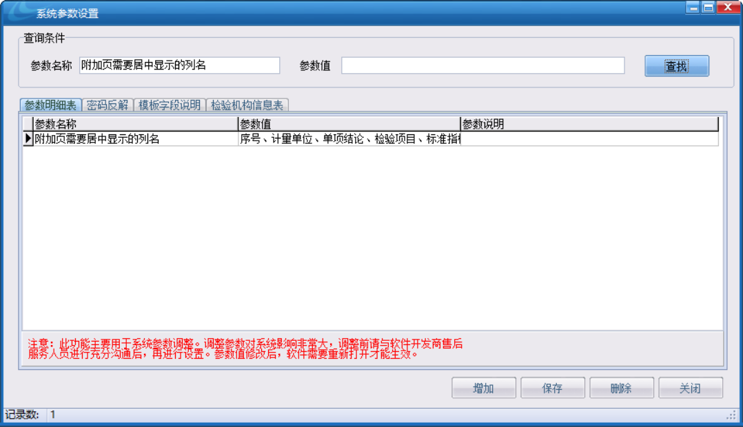 如果我們想要附加頁里面的參數(shù)內(nèi)容居中顯示,我們可以登錄管理員用戶,在系統(tǒng)維護中的系統(tǒng)參數(shù)設(shè)置里面找到【附加頁需要居中顯示的列名】這個參數(shù)名,然后在后面的參數(shù)值輸入要居中的參數(shù)名稱。