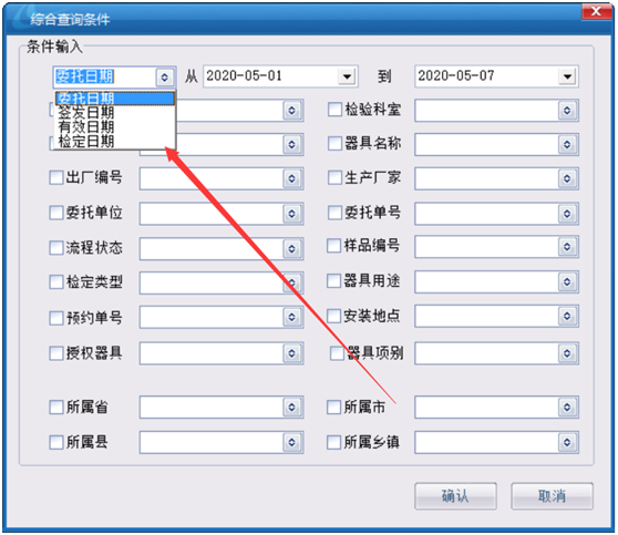 在條件選擇中可根據委托日期,簽發(fā)日期,有效日期,檢定日期進行查詢。